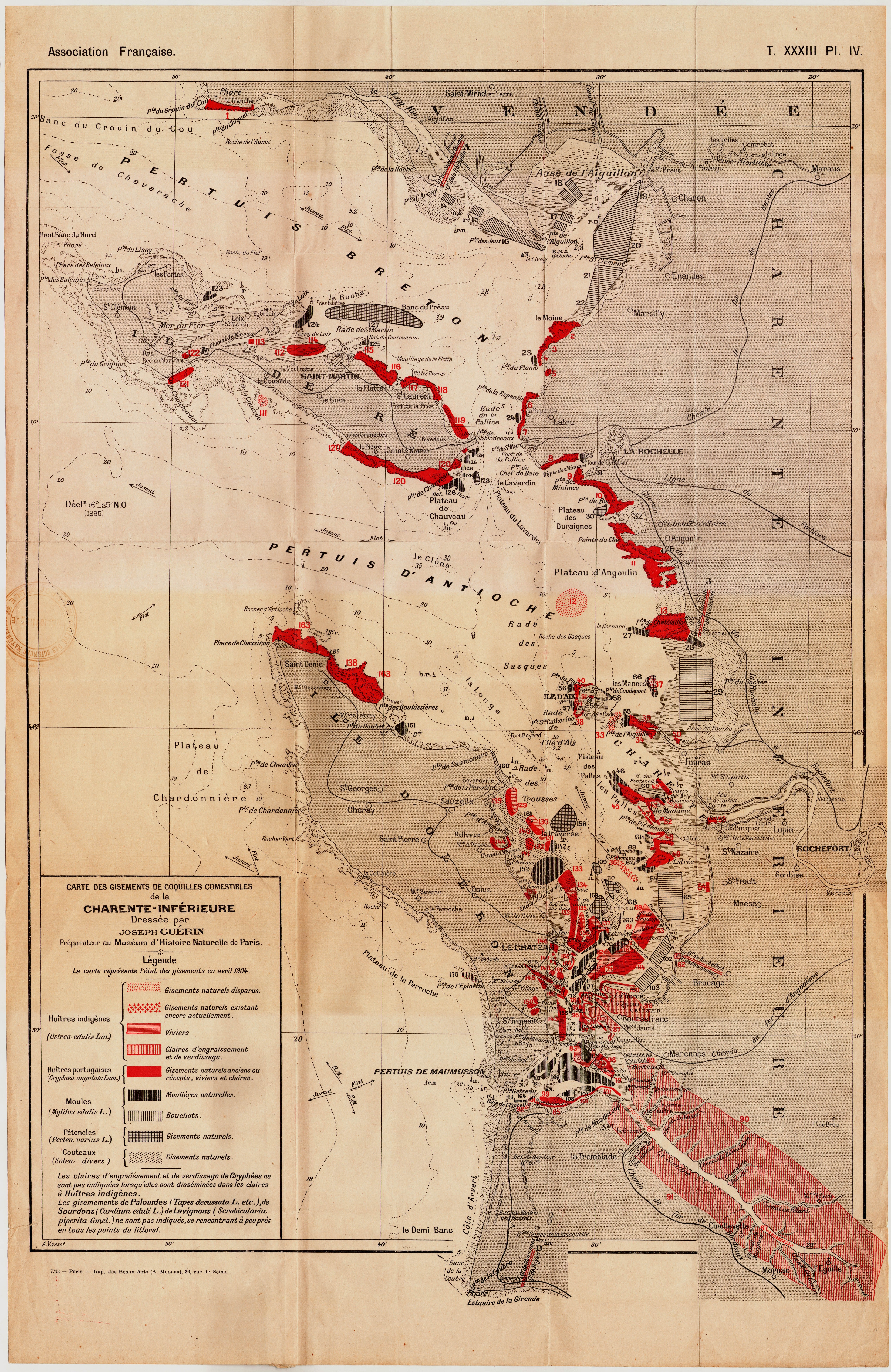 | Contenu | Cette carte recense les zones d'activités maritimes des pertuis charentais état des gisements en Avril 1904 |
